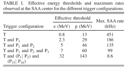 configuration and for both electrons and protons, evaluated by means of Monte Carlo simulations, are shown in Fig. 1. Each trigger configuration is associated with an effective energy threshold—reported in Table I and shown in Fig. 1 by means of gray dashed lines—for both electrons and protons, which is evaluated as the minimum energy at which the corresponding effective area is above 10% of its maximum value.1 Finally, Table I also provides the maximum rate observed at the SAA center for each trigger configuration. In Fig. 1, the electron and proton fluxes provided by the AP9 AE9 model are also reported. According to such a