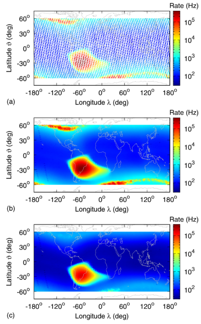 where ⌈xc is the closest integer to x. As a last step, “glitches” in the reconstructed data corresponding to sudden increases or decreases of the rate and affecting a single sample—which are spurious effects due to “jumps” in the raw data—are corrected by replacing the corresponding value with a linear interpolation of the neighboring samples. Two representative examples of the results of the over-flow correction algorithm are shown in Fig. 9 for two orbit segments: one crossing the SAA and one crossing the belts. These examples uphold the reliability of the overflow correction algorithm. Occasionally, when the particle rate changes abruptly (approximately above 20 kHz=s or, equivalently, 300 kHz= deg in latitude), a correct reconstruction of the true rate is unfeasible. This issue occurs exclusively in the belts and thus does not affect the SAA assessment. Moreover, the choice of computing the median rate observed in each map cell provides robustness against these occasional artifacts.