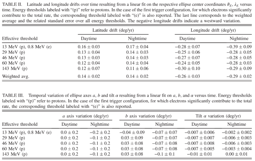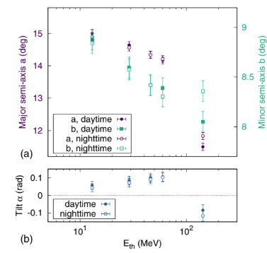 on the day and night sides. By tracing both lines in the SAA region using the Tsyganenko and Sitnov model [29] under the quiet Solar wind condition, we evaluate the geographical position of the respective footprints. We find a difference in latitude of about 0.2°, caused by the action of the Solar wind which compresses the geomagnetic field lines on the day side and elongates them on the night side. In addition, we find a difference in longitude of about 0.5°, driven by the relative twisting of the field lines. These values are compatible with the observations found in Fig. 6 and are in agreement with theoretical models [30]. It is worth remarking that day-night differences of the SAA properties were found by analyzing electron fluxes [31]. Concerning the ellipse size and tilt, namely, the semiaxes a, b, and α, the different shapes in Fig. 3 suggest a dependence on energy—and, possibly, on semiorbit condition—as well. This dependence is displayed in Fig. 4 by taking the averages over all of the time periods of the semiaxes a, b and the tilt α. Because the “longitudinal” semiaxis a is always larger than the “latitudinal” semiaxis b, we henceforth identify a as the major semiaxis. Both semiaxes decrease monotonically with increasing energy, corresponding to a shrinking of the SAA extension for progressively more energetic particles. A discrepancy between daytime/nighttime conditions is essentially absent, with the exception of the highest-energy configuration, for which the semiaxes are larger during nighttime. It is worth highlighting that this observation does not necessarily correspond to a higher nighttime flux—as shown in the flux analysis of Sec. IVA—but rather to a broader geographical distribution. Besides the daytime/nighttime