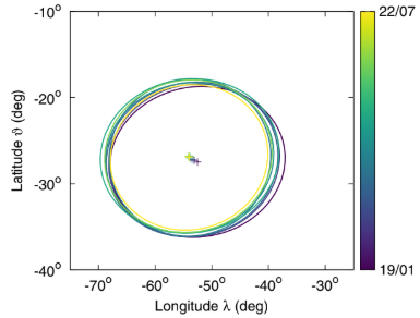 FIG. 5. SAA ellipse evolution over time for the T trigger configuration and nighttime condition. The color scale represents the central time of each time interval, from 2019-01-01 00∶00∶00 UTC to 2022-07-02 00∶00∶00 UTC.