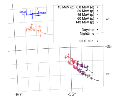 FIG. 6. SAA ellipse center coordinates for different time periods, semiorbit conditions, and energy thresholds, as reported in the figure key, within the analyzed epoch 2018–2022. The minimum of the geomagnetic field according to the IGRF model is also shown for the years 2018–2022 (topmost points). For all data points, time proceeds from right to left. To more faithfully represent the relative