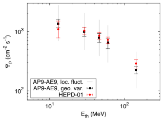 whereEth is the energythreshold. Similarly, the flux predicted by the model is assessed as Ψp 1⁄4R Emax Eth ΦpðEÞdE. Each energy threshold Eth corresponds to a single trigger configuration, and the corresponding Eth values are those reported in Table I. Accordingly, each Ψcp value computed as described above is contributed by the rate measured by a single trigger configuration. Figure 7 shows the estimated integral flux and its comparison with the AP9-AE9 model predictions. The estimate is first carried out separately over each time period and condition; because no significant time modulation is observed (see below), the data of Fig. 7 are computed as the average over the set of estimates, while error bars are assessed as the minimum and maximum extents reached by the errors of the single evaluations. The estimates provided by HEPD-01 are in agreement with the model predictions, even by considering only the uncertainty due to the geographic variability. A breakdown of the flux estimates for each time period and condition is finally displayed in Fig. 8. Even in this case, the estimated integral fluxes are mostly compatible with the AP9 model predictions, with the exception of the case of the highest-energy threshold of Fig. 8(e). In that case, the estimate provided by HEPD-01 is systematically larger than the prediction by up to 50%.