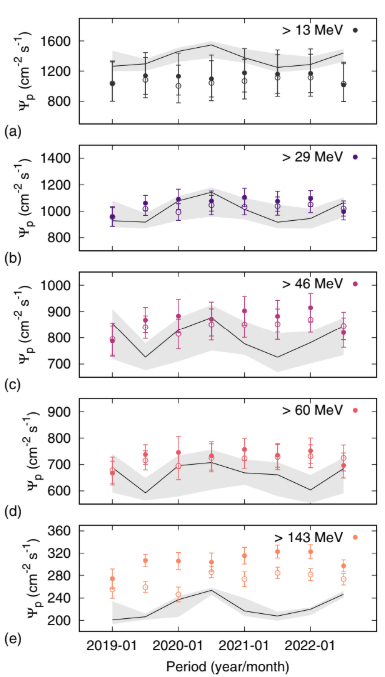 FIG. 8. Integral proton flux Ψp as a function of the time period. Each panel corresponds to a different trigger configuration, and therefore a different proton energy threshold: (a) 13 MeV, (b) 29 MeV, (c) 46 MeV, (d) 60 MeV, and (e) 143 MeV. Filled and empty points correspond to daytime and nighttime con- ditions, respectively. The solid lines and shaded areas are the AP9 estimates and the related geographical variabilities (black dots and error bars in Fig. 7). The lowest-energy evaluation is carried out by removing the electron contribution to the rate, as explained in Appendix D.