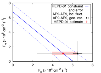 value Fe from the AP9-AE9 model (ordinate of the black point in Fig. 10) and consequently obtain an F cp value as the abscissa at which the constraint matches the assumed value of Fe (red cross in Fig. 10). The uncertainty related to this F cp estimate is promptly given by considering the maximum extent, along the Fp direction, of the uncertainty on the constraint line, namely, the red shaded area in Fig. 10; the height of the shaded area is given by the uncertainty on the Fe value (as provided by the model).