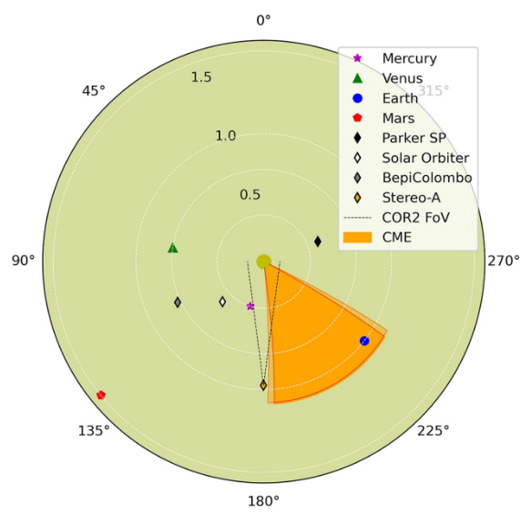 Figure 2. Geometrical properties for the propagation of the coronal mass ejection (CME) in the inner heliosphere. The positions of the inner planets and relevant spacecrafts are represented by colored symbols. The interplanetary coronal mass ejection (ICME) is represented by the orange shadowed area. The lighter orange area represent the 1σ uncertainty about the ICME position from the P-DBM runs.