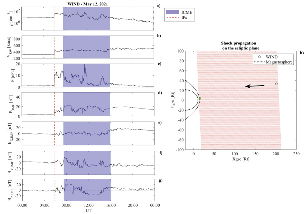 Figure 3. Solar wind parameters observed by the WIND spacecraft at L1: (a) Proton density; (b) velocity; (c) dynamic pressure; (d) interplanetary magnetic field (IMF) intensity; (e–g) IMF components (BX,IMF, BY,IMF, BZ,IMF respectively) in the GSE reference frame. The red dashed line marks the interplanetary shock as observed on 12 May at ≈5:56 UT. The blue shaded region identifies the magnetic cloud; (h) Interplanetary shock propagation in the ecliptic plane. Here red dotted lines represent the shock plane propagation in the ecliptic plane and the arrow its direction. The green rectangle represents the estimated impact position of the IPs onto the magnetopause.