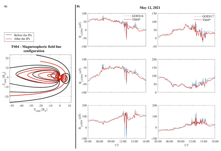 Figure 4a shows the response of the magnetosphere to the arrival of the interplanetary shock. According to the Shue et al. (1998) model, the magnetopause nose moved back to ∼6.8RE. Indeed, the shapes of the magnetospheric field lines before (black lines) and soon after (red lines) the IPs, evaluated by means of the TS04 model (Tsyganenko & Sitnov, 2005), show a large field compression. Correspondingly, on May 12 at ∼6:35 UT, GOES 16 (Figure 4b, left column; LTG16 = UT − 5) and GOES 17 (Figure 4b, right column; LTG17 = UT − 9.1) measured a sudden variation (Δt ∼ 10 min) in the north-south component of the magnetic field (ΔBz,G16 = −28 nT and ΔBz,G17 = 18.8 nT), due to the compression of the magnetosphere, coupled with a stretching of the magnetotail field lines (ΔBx,G16 = 22 nT and ΔBx,G17 = 14.6 nT), caused by the concurring contribution of the IPs impinging onto the magnetopause and of the southward switching of the IMF (Piersanti et al., 2020; Piersanti & Villante, 2016; Villante & Piersanti, 2011).