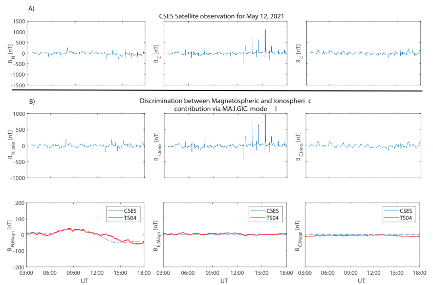 In order to quantify the contributions of magnetospheric and ionospheric origin at CSES orbit, we have applied the MA.I.GIC. model (Piersanti et al., 2019) to discriminate between different time scales in a time series. Results are shown in Figure 5b. Upper and lower panels report observations of high (∼22.3 μHz < f < ∼2.8 mHz; f being the
