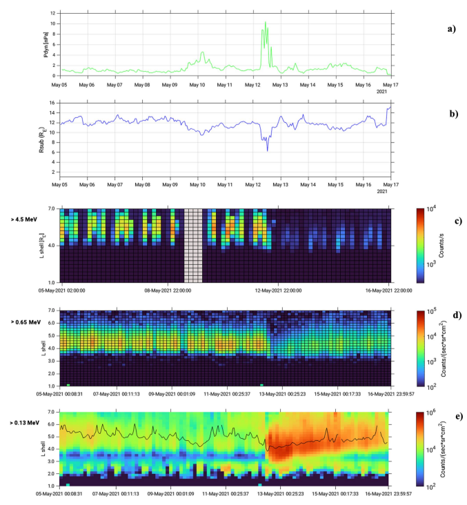 Figure 6. Panel (a): Time profile of the solar wind dynamic pressure (OMNI data magenta curve) and position of the magnetopause standoff distance (as estimated from the Shue et al. (1998) model, black curve) over the period of 5–16 May 2021; Panel (b): >0.13 MeV electron fluxes measured by MEPED-90° over the same period. The superimposed black line represents the position of the plasmapause as estimated from the X. Liu and Liu (2014) model; Panel (c) >0.65 electron fluxes measured by the azimuthal MEPED-90° telescope on board the NOAA19 satellite over the same period; Panel (d): Rates of >4.5 MeV particles detected by High-Energy Particle Detector (HEPD-01) over the same period. Gray shaded areas refer to time intervals for which HEPD data are not available.