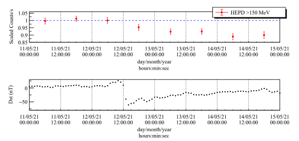 Figure 7. 12-hr averaged galactic cosmic-ray (GCR) proton intensity variation profile as a function of time from High-Energy Particle Detector (HEPD-01) observations in the >150 MeV energy range (top panel). A clear suppression of GCR intensity can be spotted after 12 May 2021 0600 UTC. At the same time, it is possible to see an abrupt variation in Dst index (bottom panel).