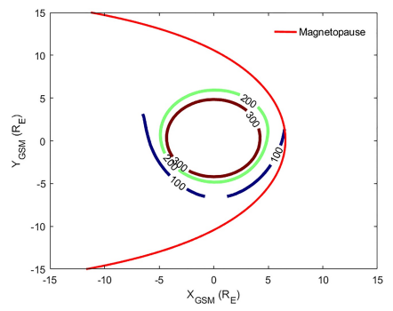 Figure 8. Equatorial GSM cuts of the TS04* modeled magnetosphere at the time of maximum compression. The red curve represents the location of the magnetopause boundary. The other colored lines represent the iso-contours of the local magnetic field strength over the 100–300 nT range.